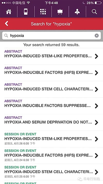 我們還是先在ISSCR會議手機APP上進(jìn)行查看了關(guān)鍵字檢索。