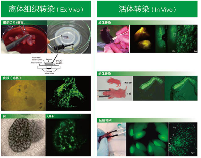 3、活體組織轉(zhuǎn)染(胚胎、肌肉、皮膚、肝臟、腎臟、肺、睪丸、卵巢、腦部、視網(wǎng)膜、角膜等小鼠、大鼠、斑馬魚、爪蟾、豬、羊、雞、兔子、蜜蜂、水蚤、渦蟲、植物種子等)
